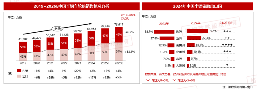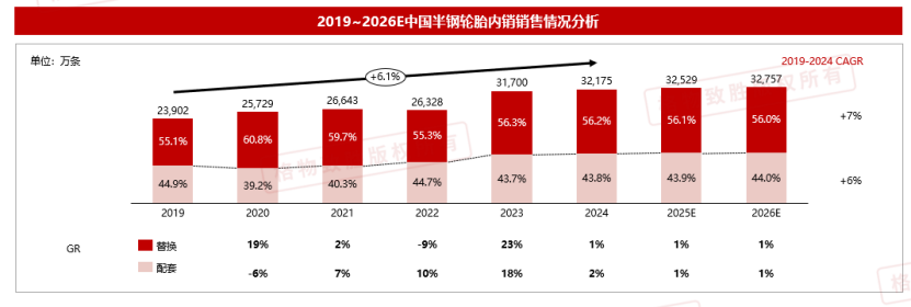 • 中国乘用车销量及保有量的持续增长,推动了半钢轮胎行业的发展,轮胎行业规模不断扩大。2024年整体市场规模已超6亿条,2019—2024年的复合增长率约为10%。