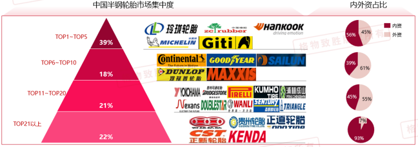 • 中国半钢轮胎市场集中度较高,TOP10品牌占整体销量份额的50%以上,其中只有玲珑、中策、赛轮、玛吉斯四家中国轮胎品牌,而外资品牌占据6家,从头部乘用车市场来看,外资品牌的销量比重还是非常高的。