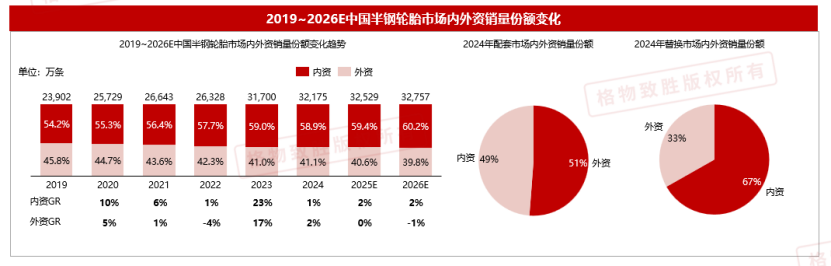 • 2024年中国品牌轮胎销量的比重为58.9%,较上一年保持持平百分比,预计未来内资品牌凭借性价比优势以及不断累积的品牌影响力,在中国的半钢轮胎市场比重持续上升。
