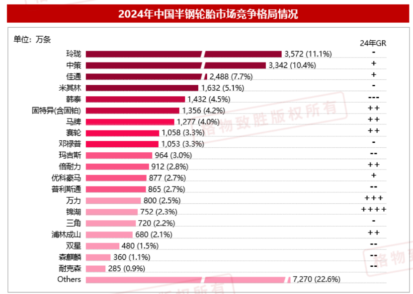 • 玲珑凭借国内年销量接近4000万条,排名第一,中策凭借国内年销量突破3000万条,排名第二,佳通国内年销量接近2500万条,排名第三。