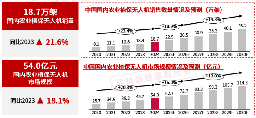 - 同期内,中国农业植保无人机市场规模持续扩张。前期市场增长主要依托技术推广落地与补贴政策红利的释放,逐步实现应用规模效应。预计2024至2030年,整体市场规模仍将保持增长的态势,但增速可能渐趋平稳。