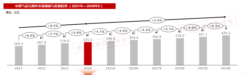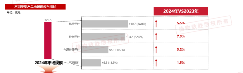 - 气动元器件市场2024年中国市场业绩约为325.5亿元,较去年同比5%左右的增长,行业需求依赖下游制造业,汽车制造尤其是新能源汽车和电子元件加工如电子半导体行业贡献主要增量,另外受工业自动化程度提升、国产替代政策推动的影响,整体保持较为稳定的增长。