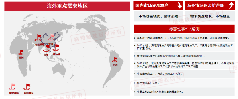 - 润滑油向东南亚、中东及南美扩产,国内产能减产。