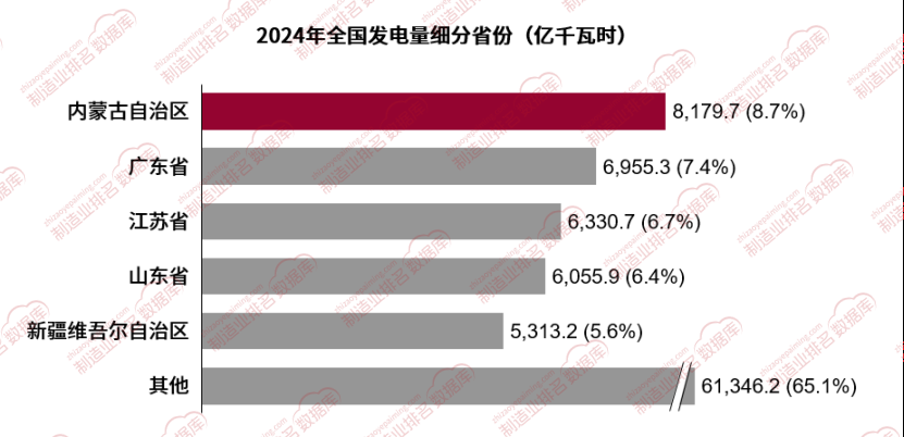 2024年全国发电量达94181亿千瓦时,全国发电量排名靠前的省份是内蒙古自治区、广东省、江苏省、山东省和新疆维吾尔自治区。
