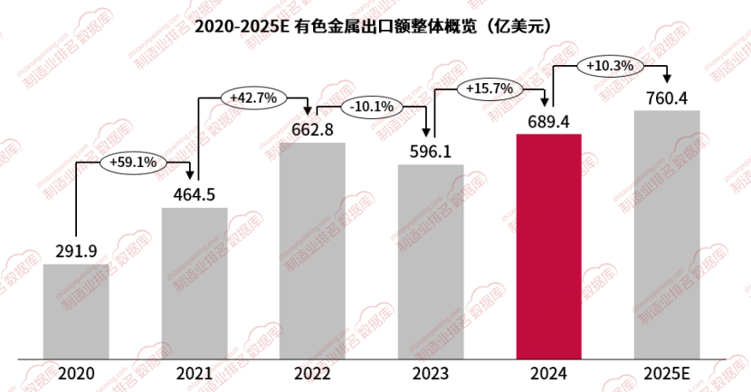 2024年中国有色金属出口额达到689.4亿美元,同比2023年增长了15.7%,出口额的增长主要得益于全球经济的复苏和新兴市场的崛起,以及中国有色金属行业在产品质量、技术创新和品牌建设等方面的不断提升。