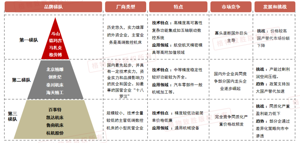 外资品牌主导高端数控产品,国内头部厂商国产替代加速,小型民营以价格优势扩大市场份额,外资品牌如斗山、德马吉等,属于第一梯队,凭借其悠久的历史、先进的技术和强大的品牌影响力,在高端数控产品市场占据主导地位,通常拥有完善的研发体系和制造工艺,能够为用户提供高性能、高精度的机床产品,满足航空航天、汽车制造、模具加工等领域的高端需求。