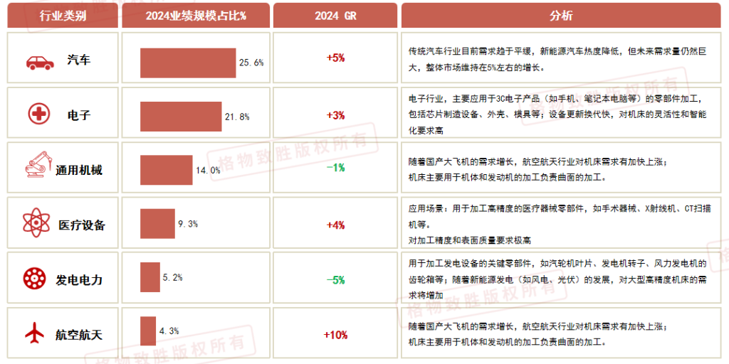 机床应用集中在汽车、电子、通用机械等行业,2024年市场规模占比分别为25.6%、21.8%和14%,TOP3行业占比整体业绩的61.4%,其中汽车、航空航天需求增长最快,电子、医疗行业保持稳定增长。
