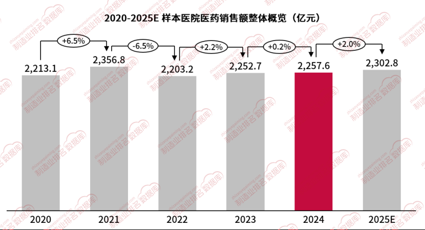 全国样本医院用药市场2024年总销售额为2257.6亿元,同比增长0.2%。虽然增长放缓,但仍未回到疫情前的总体市场水平,分级诊疗、药品集中采购等政策对医院用药市场产生深远影响。