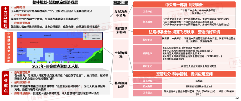 • 但产业发展仍面临多重瓶颈:发展方向缺乏清晰指引;法律规章存在空白,技术标准与监管职责不明确;基础设施建设滞后;空域管理难度大。为破解这些难题、推动无人机产业健康发展,中央从全局出发整体出台政策,不仅明确产业发展方向、填补法规空白,还针对性解决基建与空域管理问题,为无人机产业高质量发展提供清晰指引与有力保障。