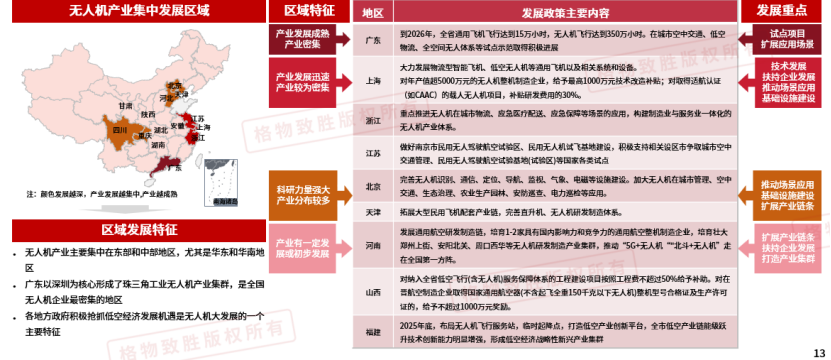 • 国内多省市大力布局无人机产业,展现出差异化区域特色与政策方向。产业成熟区域侧重试点项目发展与应用场景拓展,产业发达区域主攻技术突破、场景推广及基建完善以提速产业,产业初步发展区域通过打造产业集群、扶持企业等协同发力,推动无人机产业深度进阶,加速构建多层面、多维度的产业发展体系。