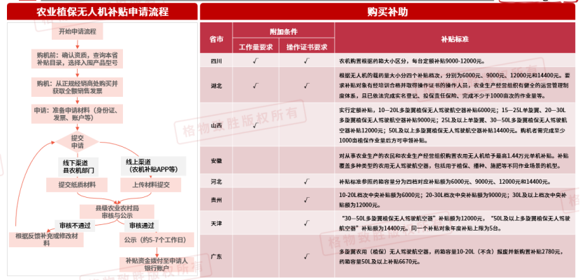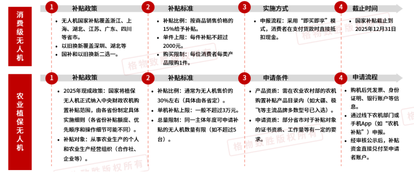 • 消费端以“以旧换新”“国家补贴”等消费券形式推动科技产品普及,体现普惠性导向;农业端则延续农机购置补贴路径,专项支持智慧农业应用。这类补贴显著降低了用户的初始投入成本,有效促进了无人机在消费与生产领域的规模化应用和产业生态发展。
