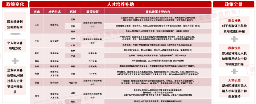 • 随着新规落地和无人机应用场景不断拓展,各地普遍出现具备资质的无人机操控人员短缺现象。为应对人才缺口,多省市已推出培训补贴等扶持政策,旨在加快专业人才培养,进一步推动无人机技术在各类行业中的规模化与深度应用。