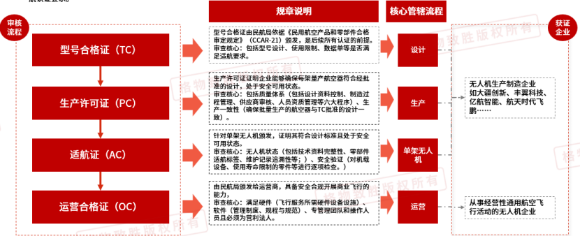 • 中国民用航空局(CAAC)针对无人机安全建立了完善的合格审定体系。该体系涵盖四类核心证书:型号合格证、生产许可证、适航证和运营合格证。前三者主要面向无人机制造企业,聚焦航空器本身,旨在确保“设计合规、生产可控、单机安全”;运营合格证则针对无人机运营企业,侧重对运营主体和运行规范的管理。