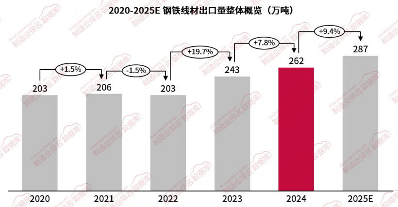 2024年中国钢铁线材出口量为262万吨,同比增长7.8%,相比2023年出口量增长了19万吨。这一增长表明中国钢铁线材在国际市场上的竞争力有所提升,且国际市场需求有所增加。