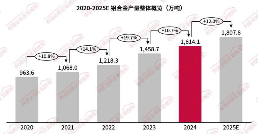 2024年中国铝合金产量达到1614.1万吨,较上年增长10.7%,受传统领域稳定支撑,新兴领域需求增长带动产量提升。