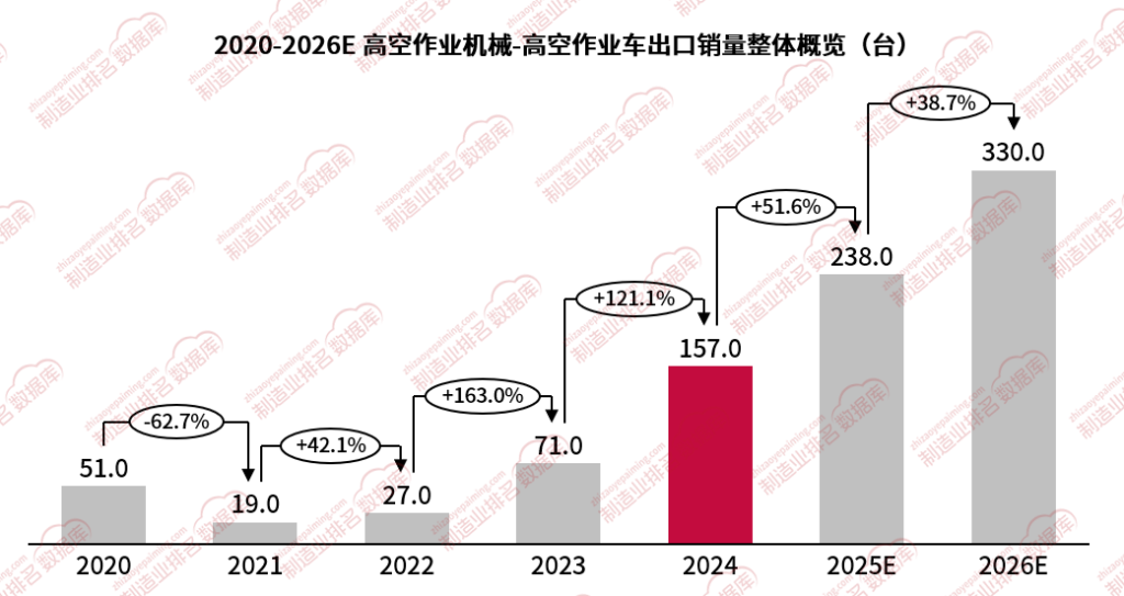 在工程机械“内销承压、出口破局”的大趋势下,高空作业车作为细分领域的潜力股,出口市场实现了从“小众试探”到“稳步放量”的跨越式发展。2024年高空作业车出口销量达到157台,同比2023年增长了121.1%。