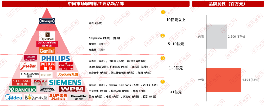 国内咖啡机市场中,目前外资品牌整体市场占比更高,但后续增长动能逐步放缓;国产品牌当前市场份额相对偏低,未来增长速度则更为突出。该格局差异,本质源于行业发展阶段不同、品牌竞争优势分化以及双方增长空间错位等多重因素共同影响。