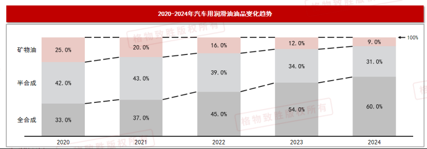 - 2020年起,矿物油市场持续萎缩,其存量主要流向10年以上车龄的老车型;作为过渡性产品的半合成油,自2021年起也进入缓慢下降通道;全合成油则呈现高速增长态势,一方面得益于政策推动,另一方面源于终端市场需求的持续增长。