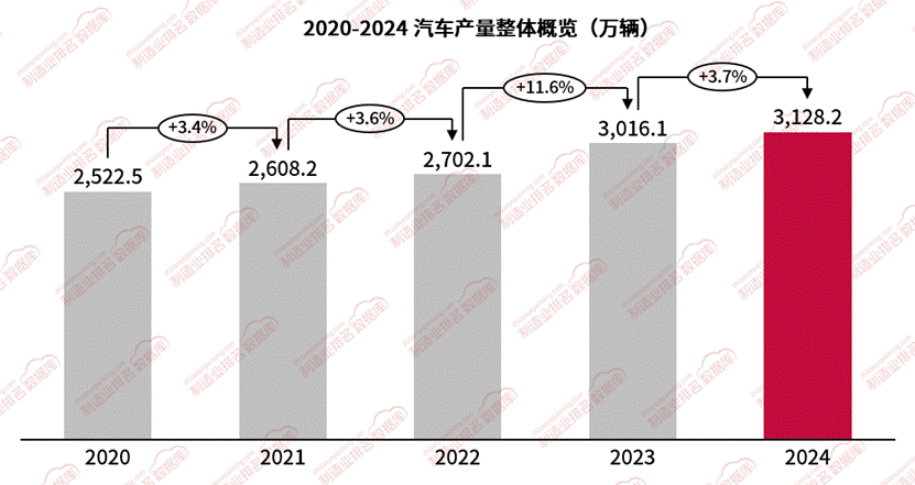 2024年,中国汽车产量实现稳步增长,全年产量达3128.2万辆,同比增长3.7%。产量突破3100万辆大关,全年产量呈现“前稳后升”的态势,12月作为年度收官月份,汽车产量达336.6万辆,同比增长9.3%,为全年产量增长注入强劲动力。