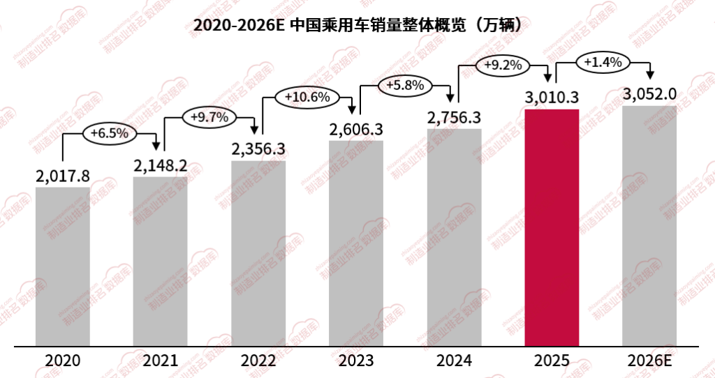 中高端新能源轿车需求持续旺盛,传统燃油轿车市场份额则进一步收缩。MPV市场尽管整体规模有限,但新能源化趋势日益明显。展望2026年,乘用车市场预计延续增长态势,但增长幅度将有所收窄,预测2026年乘用车销量约为3052万辆。