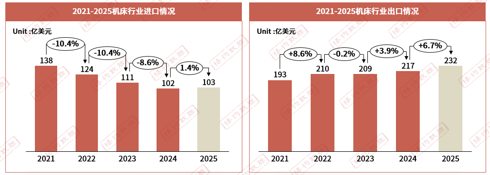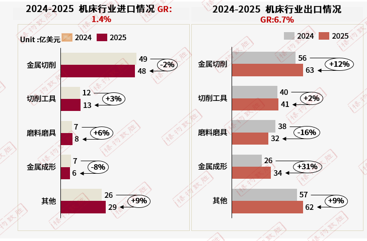 金属加工机床(切削 + 成形)增速亮眼,国产设备在全球市场的份额与价值持续提升;进口端成形机床替代加速,切削机床降幅收窄,体现国产高端化进程。