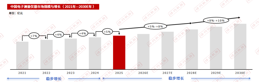 从趋势看,市场增长节奏将逐步提速:2025-2028年年复合增速有一定回升,2028-2030年进一步升至8%-10%,2030年规模预计达500亿元以上。这种提速并非短期脉冲,而是 “半导体技术迭代 + 物联网/ 新基建渗透 + 消费电子创新” 多重逻辑的共振结果 —— 电子测量仪器市场天花板将随国内高端制造的深化持续抬升,长期增长的确定性较强。