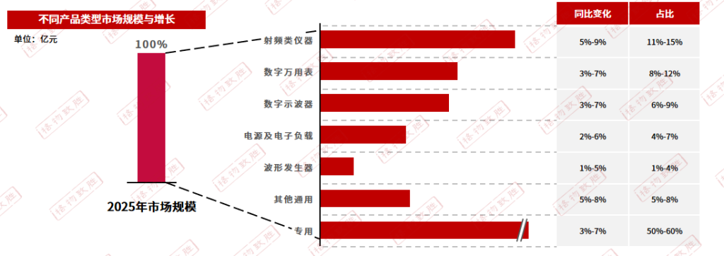 射频类仪器以 11%-15% 的份额和5%-9% 的增速成为增长主力,这背后是 5G/6G 通信基建、射频器件研发、新能源汽车智能化(如车载射频模块)等下游赛道的景气度驱动 —— 通信技术迭代与汽车电子升级,直接放大了射频信号测试的需求,让该品类成为当前市场的增长亮点。