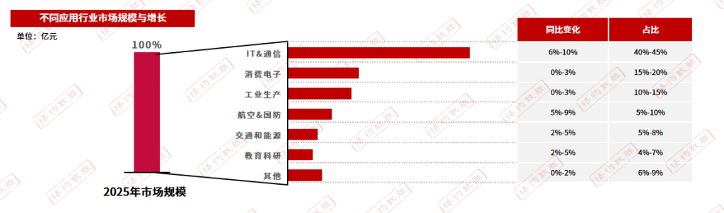 消费电子(15%-20%份额)与工业生产(10%-15%份额)的增速却相对平缓(0%-3%):前者对应手机、家电等终端产品的市场成熟度提升,常规测试需求已趋于稳定;后者则是传统工业生产环节的测试设备渗透率较高,升级节奏慢于前沿技术领域,需求以替换为主。