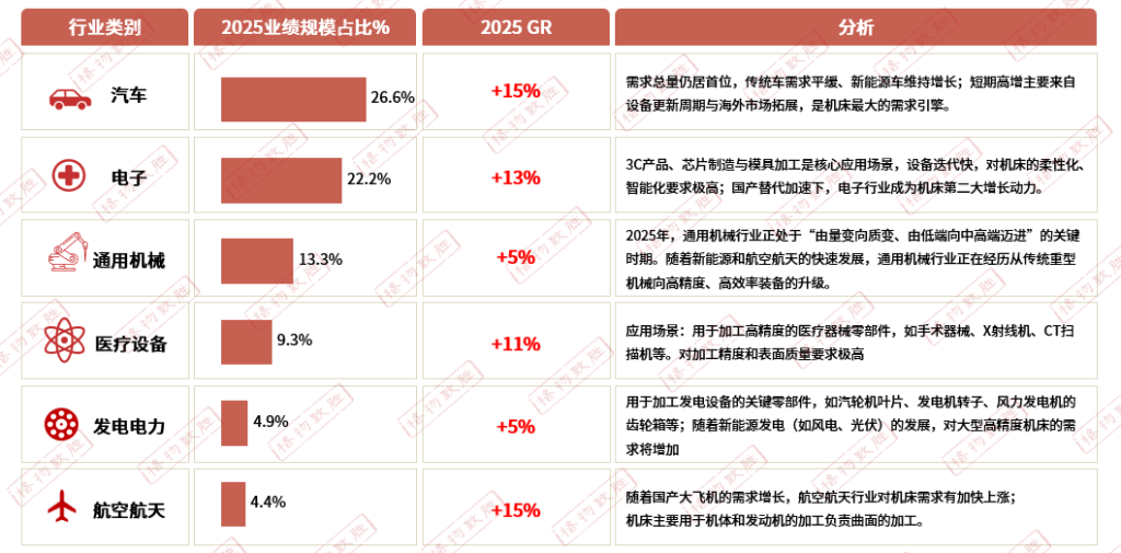 机床应用集中在汽车、电子、通用机械等行业,其中汽车、航空航天需求增长最快,电子、医疗行业保持稳定增长。
